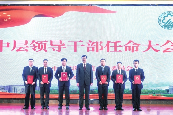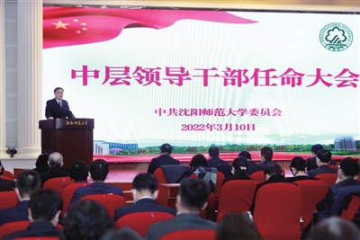 党委书记贾玉明在任命大会上讲话中指出,本次换届中,学校共任命了212名中层干部,新提拔干部44名,干部队伍年龄结构进一步优化、学历水平进一步提升。本次换届集中体现坚持党的领导,严格把关;坚持依法依规,严密程序;坚持德才兼备,优中选优;注重实绩,群众公认;坚持人岗相适,事业为重;坚持严字当头,严肃纪律等六方面特点。贾书记指出,站在第二个百年奋斗目标新起点,开启学校内涵发展建设新征程,全校中层干部责任重大,使命光荣。广大干部要牢记为党育人、为国育才的初心使命,聚焦立德树人根本任务,强化育人情怀、不负师生期待,在全力推进学校内涵发展持续实现重大突破中展现新气象新担当新作为。一是要涵养政治生态,营造干事创业氛围;二是要带头担当尽责,保持务实勤勉;三是强化攻关锐气,培养钻研精神;四是练就过硬作风,做到清正廉洁。全校中层干部要自觉做习近平新时代中国特色社会主义思想的坚定信仰者和忠实实践者,忠实践行忠诚干净担当的新时代好干部标准,不忘初心、牢记使命,埋头苦干、勇毅前行,走好建设优势特色鲜明高水平师范大学的奋进之路,以优异成绩迎接党的二十大胜利召开。