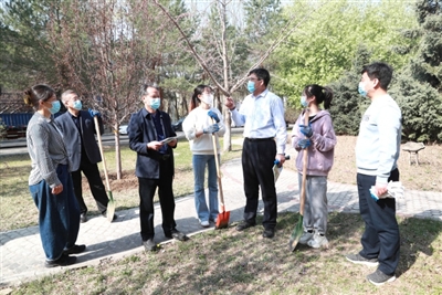在校部楼南,校长郝德永、副校长韩国海、许金龙、杨杰、刘铸与部分师生代表共同挥锹铲土、挖坑扶苗、填土栽培、浇水灌溉,种植了8株玉兰树苗和12株海棠树,为校园注入了新的生机和绿意。