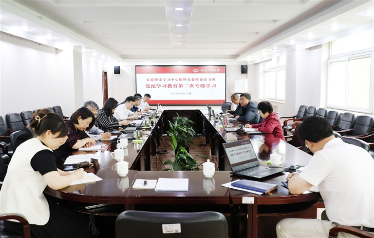 本报讯(记者 龚志军) 5月14日,学校党委在校部303会议室召开党委理论学习中心组暨党委常委读书班党纪学习教育第三期专题学习会议,认真学习领会习近平总书记五四青年节重要寄语精神和习近平总书记对学校思政课建设作出的重要指示精神,传达学习《中华人民共和国保守国家秘密法》《辽宁省文明行为促进条例》和民法典相关内容,集体学习《中国共产党纪律处分条例》部分条文,研究各项工作落实。学校党委理论学习中心组成员参加学习,相关职能部门、教学单位负责人列席会议。党委书记郝德永主持会议并作中心发言,党委常委、副校长佟玉平围绕学习贯彻《中国共产党纪律处分条例》作重点发言。