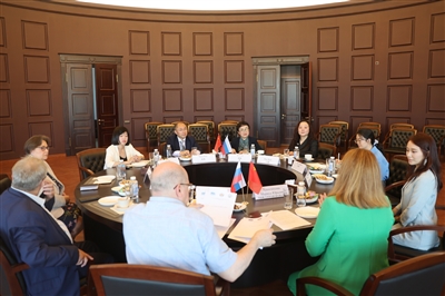 揭牌仪式前,相关负责人召开工作会议,双方就中文学习测试中心建设中长期发展规划,设计、化学、计算机及人工智能等领域的师生互访合作事宜进行了商讨,并就2025年在该校开展中俄戏剧联合展演及演出服饰设计展览的合作方案达成了共识。