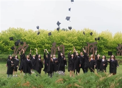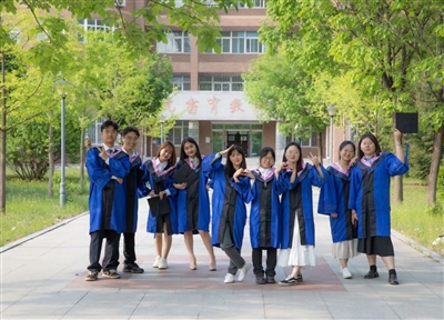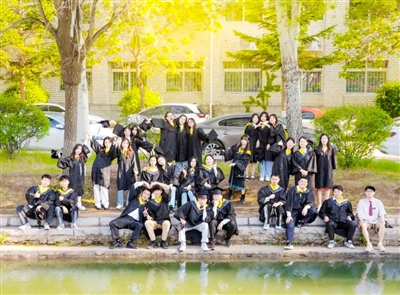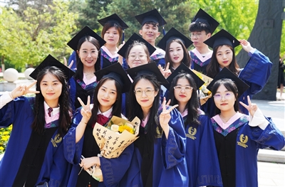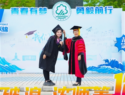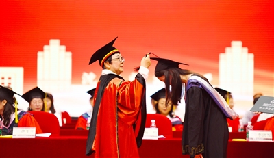 在庄严而隆重的学位授予仪式上,校学位评定委员会主席、校长杨松为各专业毕业生代表拨流苏、颁发学位证书并合影留念。
