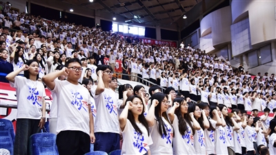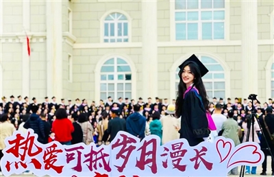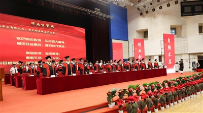 全体毕业生在软件工程专业学生黄祯妮同学的带领下庄严宣誓。熟悉的旋律再次响起,沈阳师范大学2024届学生毕业典礼暨学位授予仪式在慷慨嘹亮、激昂澎湃的校歌声中,在母校赠送学子的巨幅画卷“且将青春留师大,愿以此心赴山河”的深深感动里圆满落幕。(摄影 龚志军)